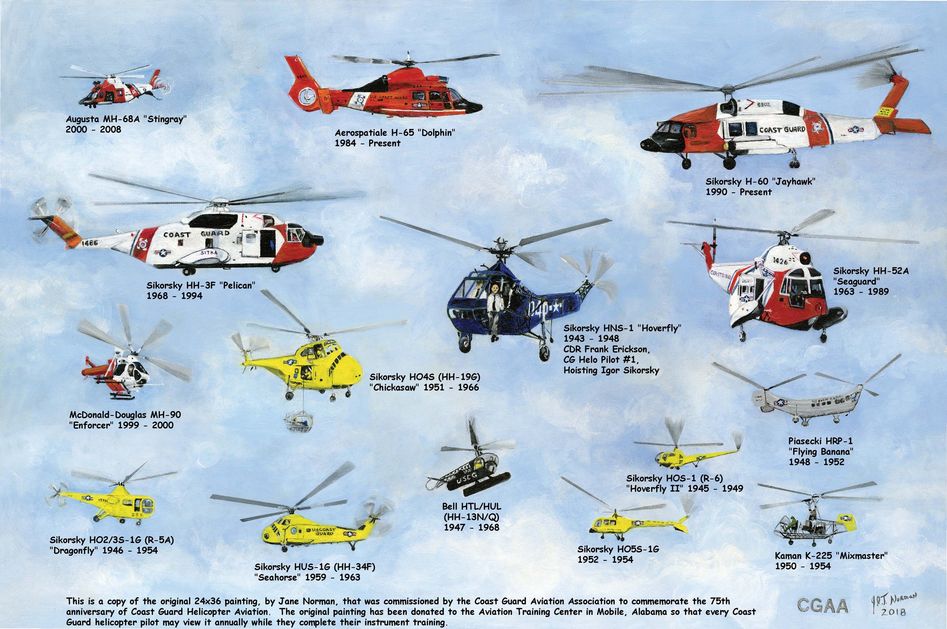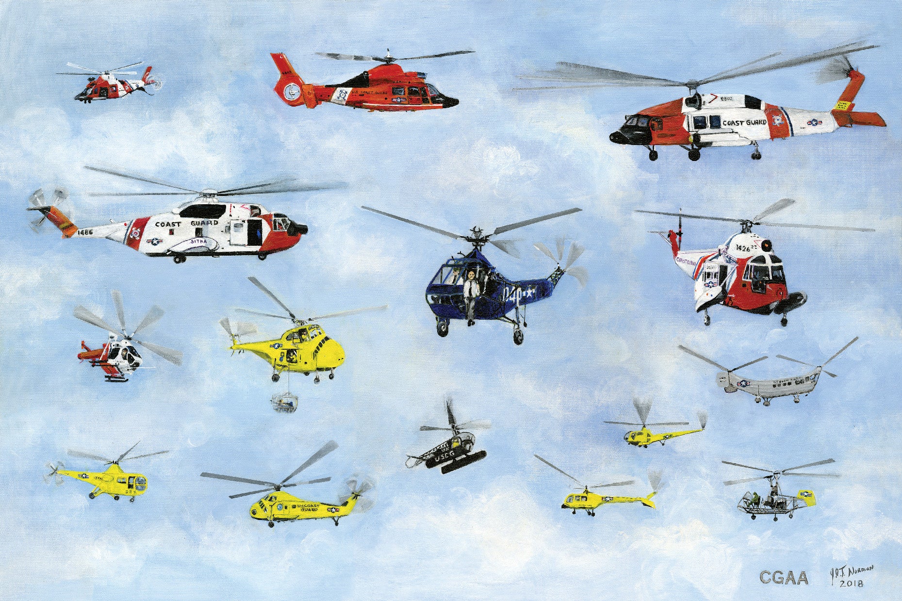Over the last 75 years there have been many helicopters used in the USCG. From the HH-3 crafts, to the new H-60, they are all here. This print is copied from an original painting and mounted as a canvas.