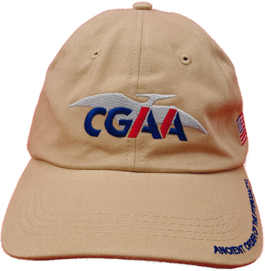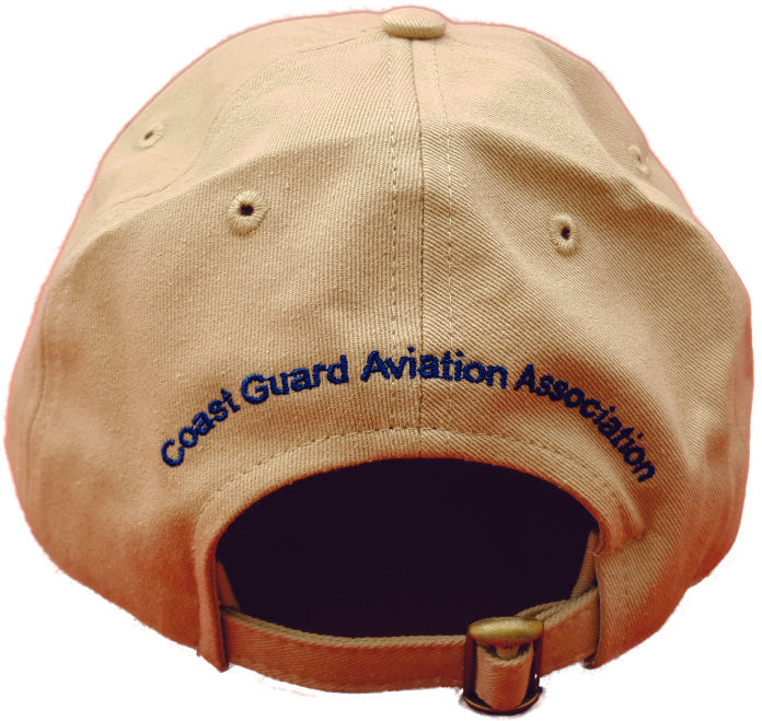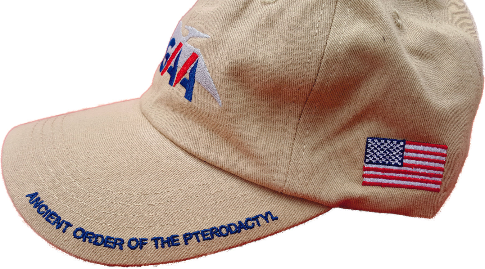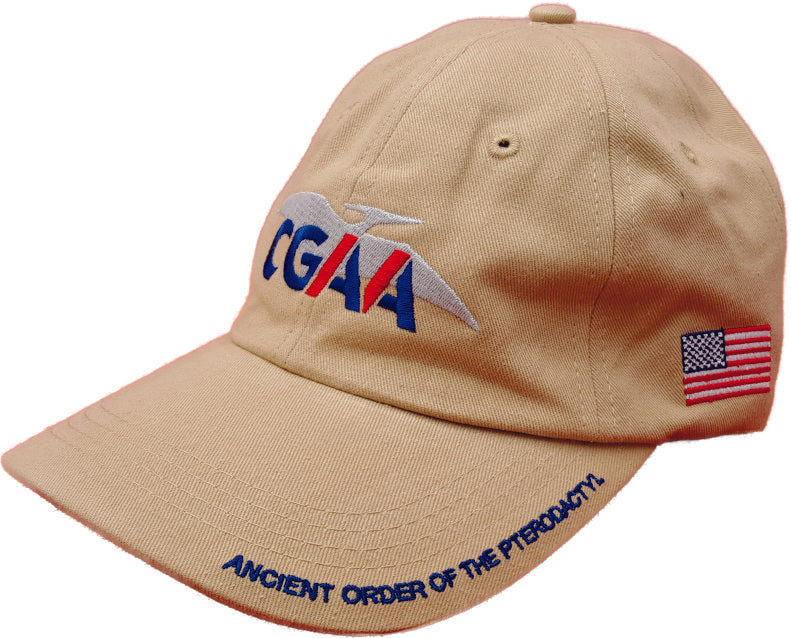 Khaki baseball cap with CGAA pterodactyl logo on front, "Ancient Order of Pterodactyl" on bill, American flag embroidery over ear, and Coast Guard Aviation text arched over back velcro strap. Cotton material,