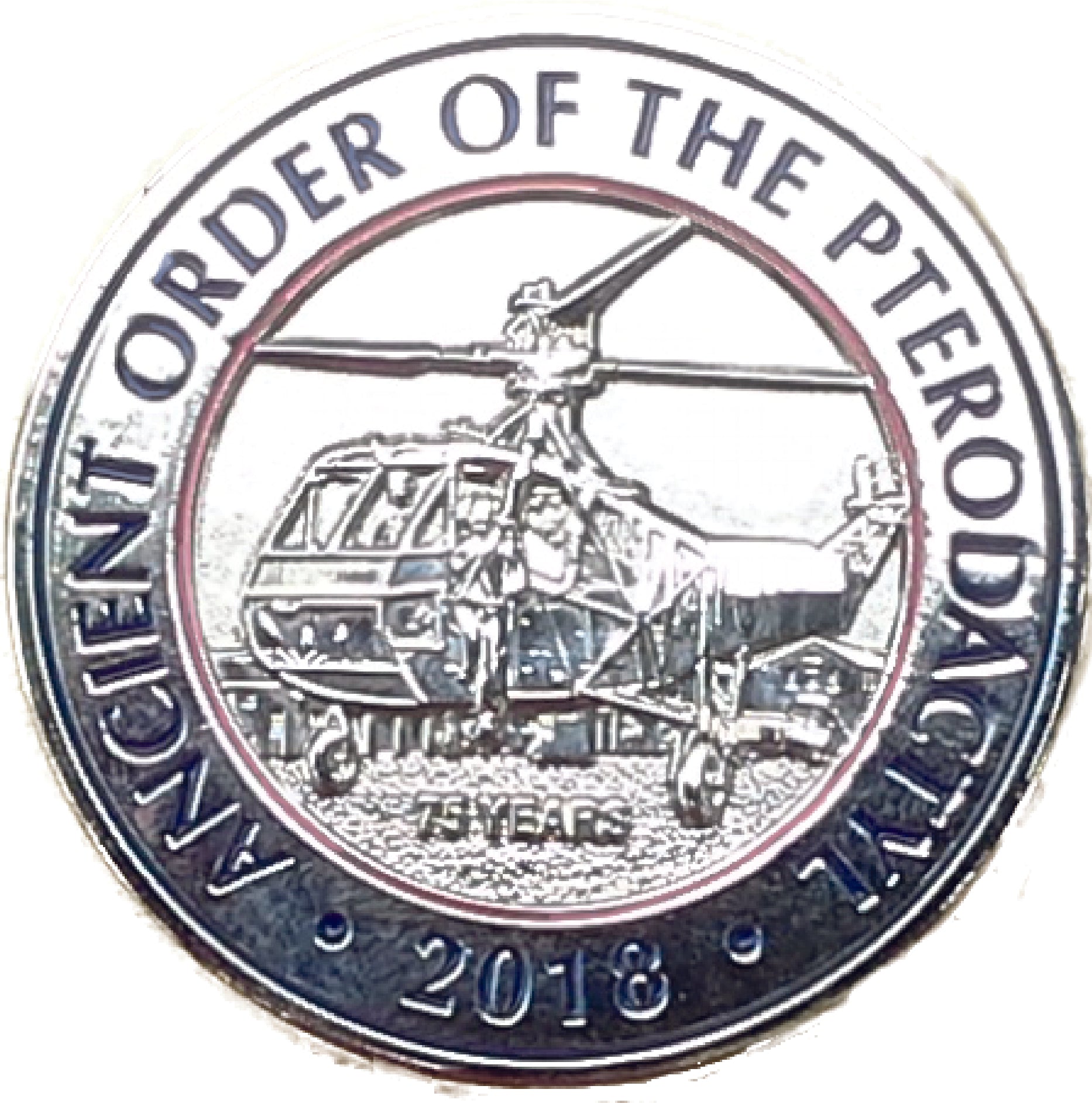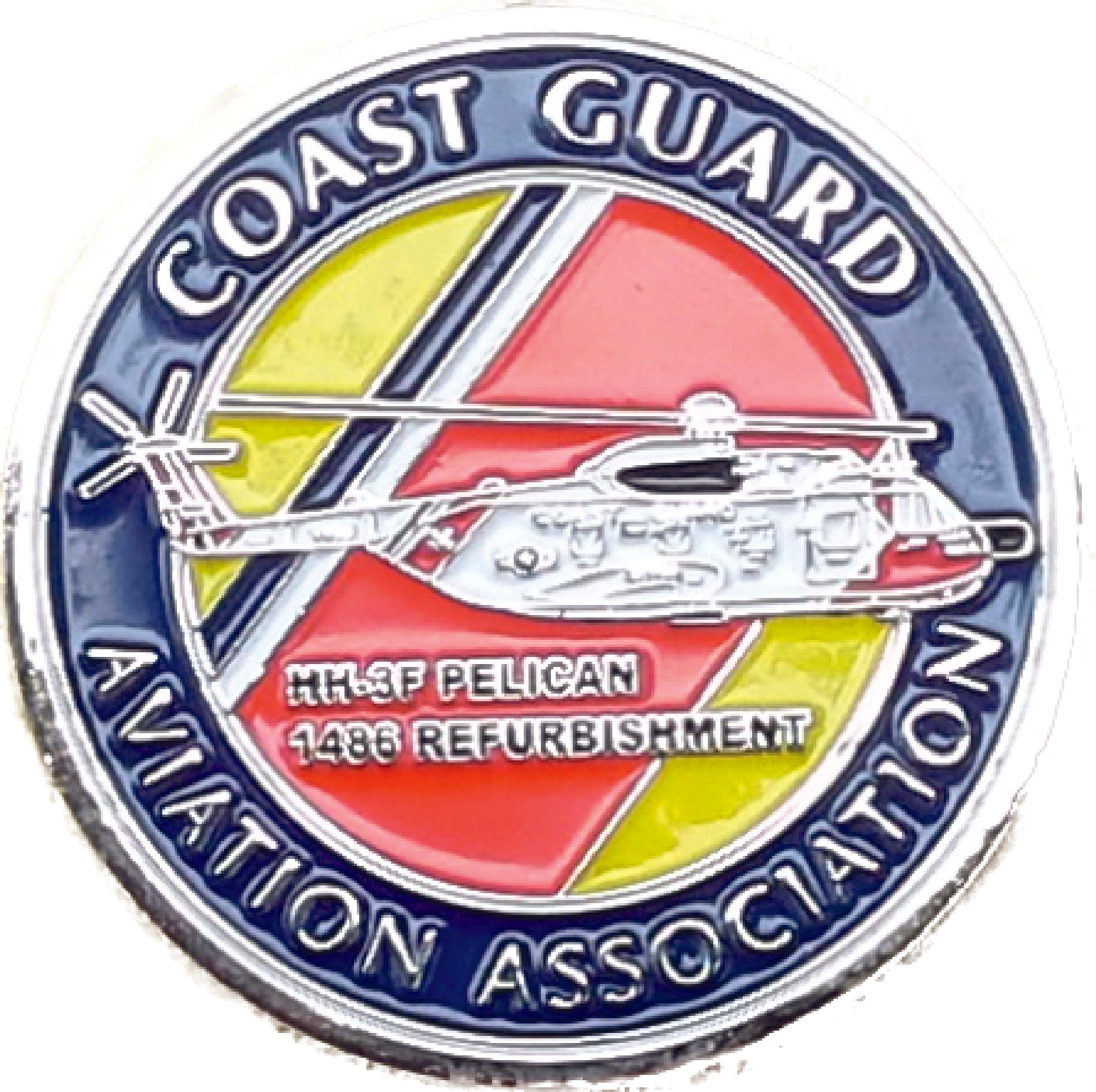 Commemorative Challenge Coin for the refurbishment of the HH-3F Pelican helicopter.  Silver in color with 3D graphics of the helicopter. Front shows the helicopter in flight.  1.75" in diameter.