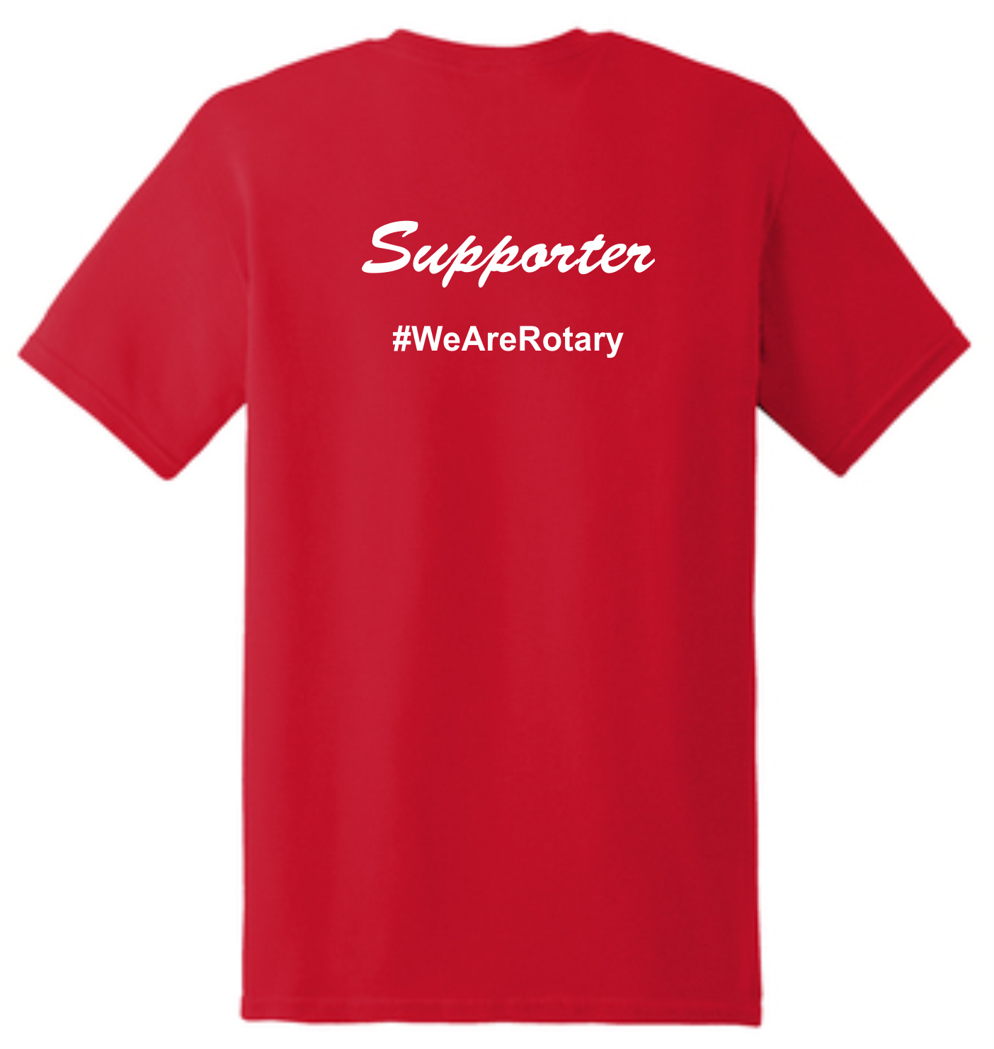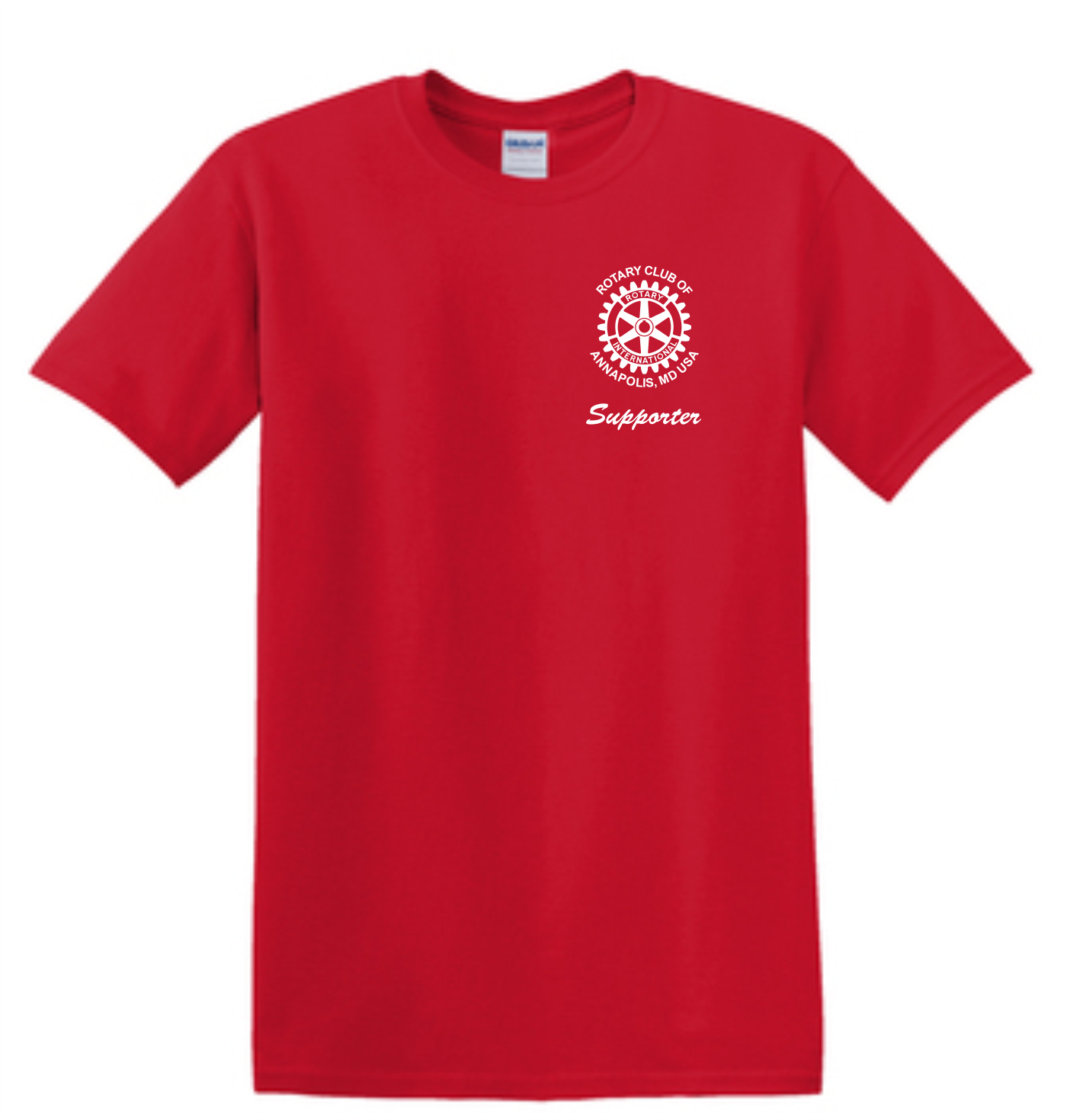 Do you have some friends helping you at a Rotary volunteer event? This red shirt shows their support for Rotary while being dressed in the "red uniform". The Rotary Club of Annapolis logo on the front, "Supporter and #WeAreRotary" is screened on the back.