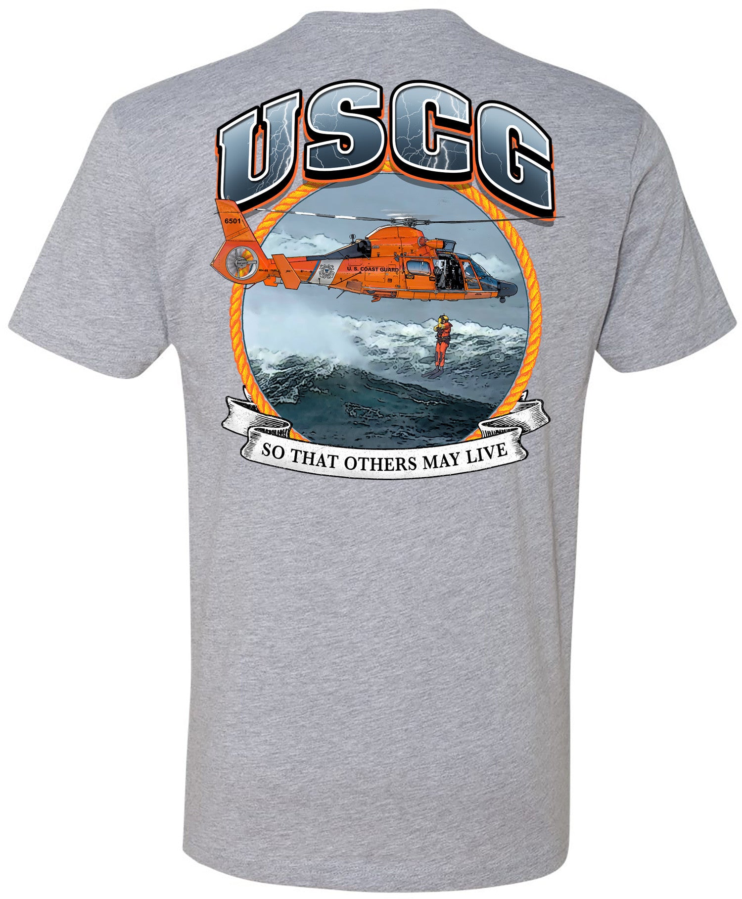 ThumbsUp Pterodactyl logo on the front chest and H-65 So that others may live on the back. This full color image is on a 4.3 ounce fitted crewneck t-shirt. 100% cotton, 32 singles. Soft enough to sleep in.