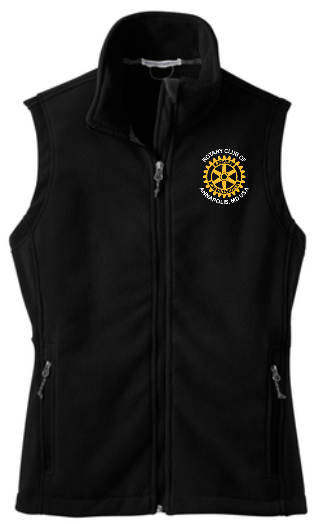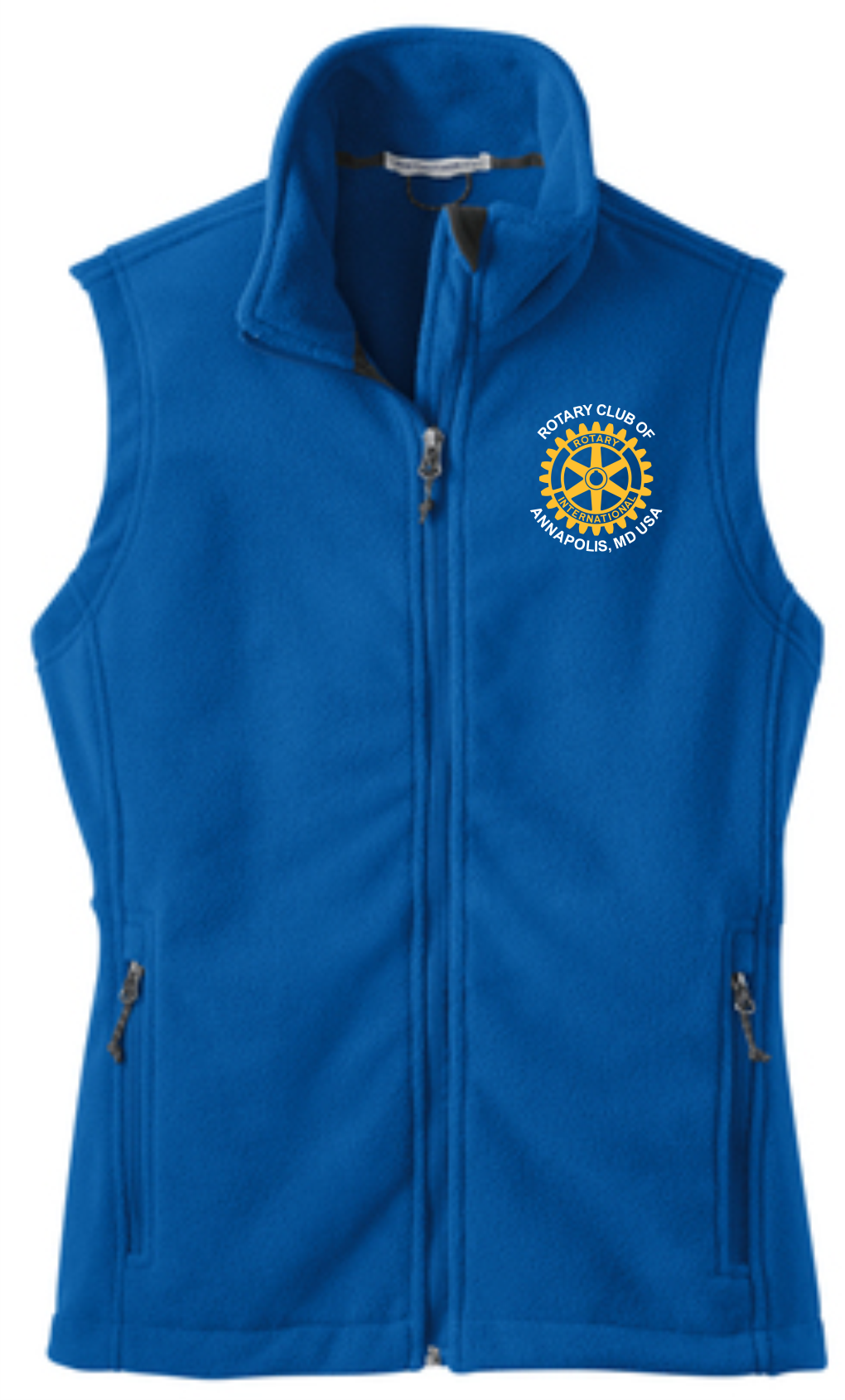 When long sleeves are too much this ladies fleece vest is just right. Full front zipper, zip pockets, and a classic ladies cut. The Rotary Club of Annapolis, MD USA logo is embroidered on the left chest.