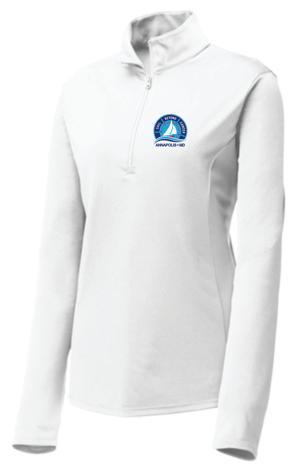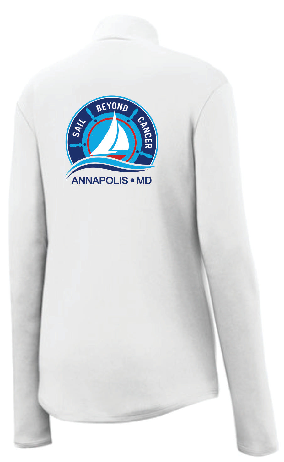 This ladies wicking polo has a fully sublimated Sail Beyond Cancer/Annapolis logo on front and back. Besides being lightwt and a wonderful layering piece, there is a 1/4 zip with collar to make it bit dressier. 100% polyester.