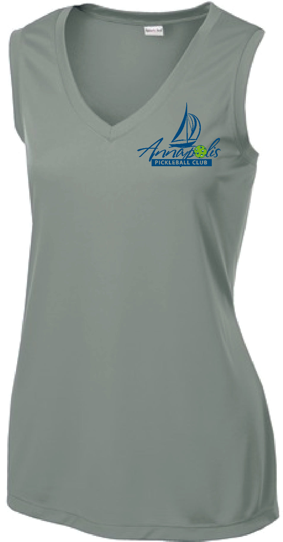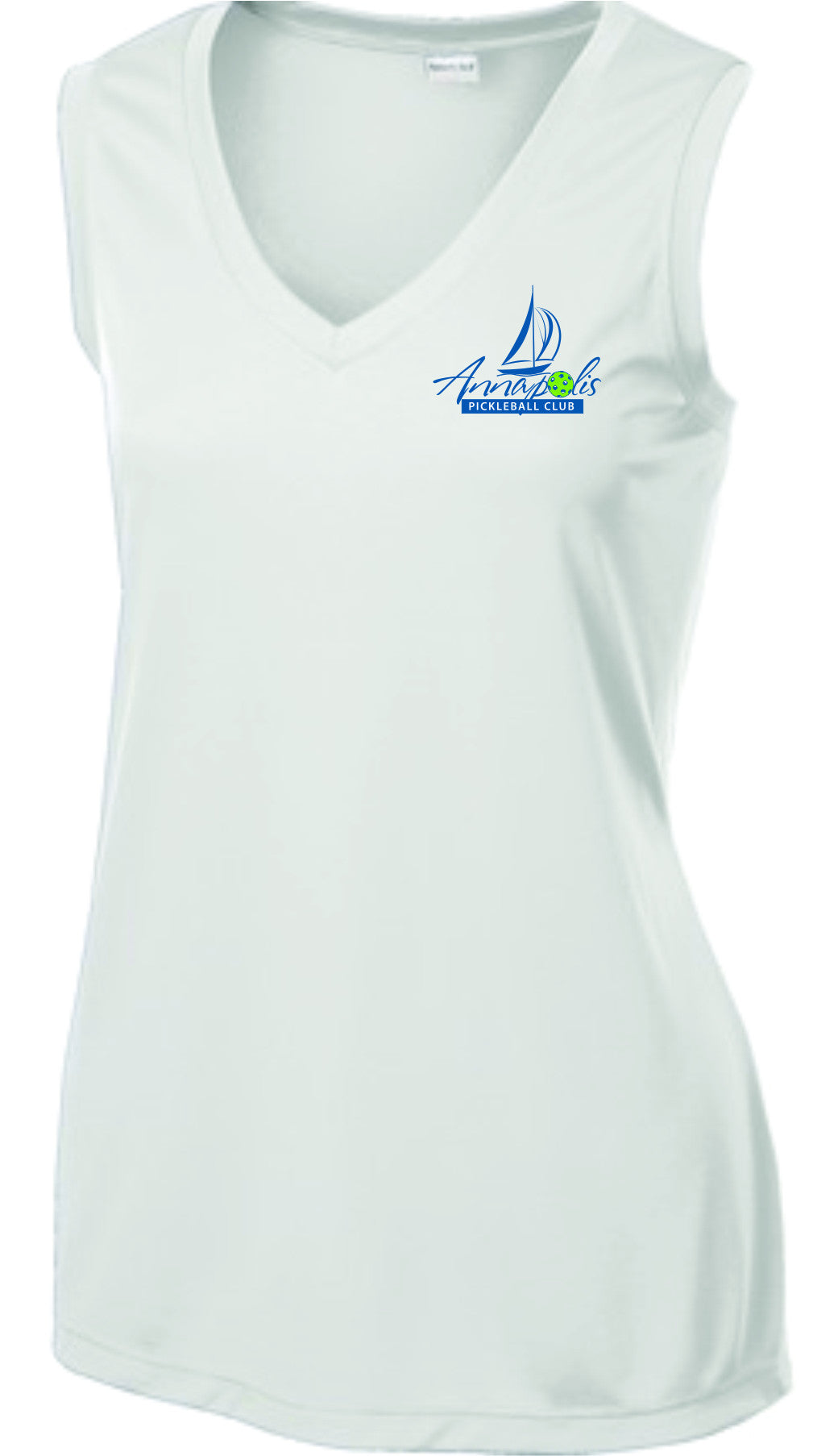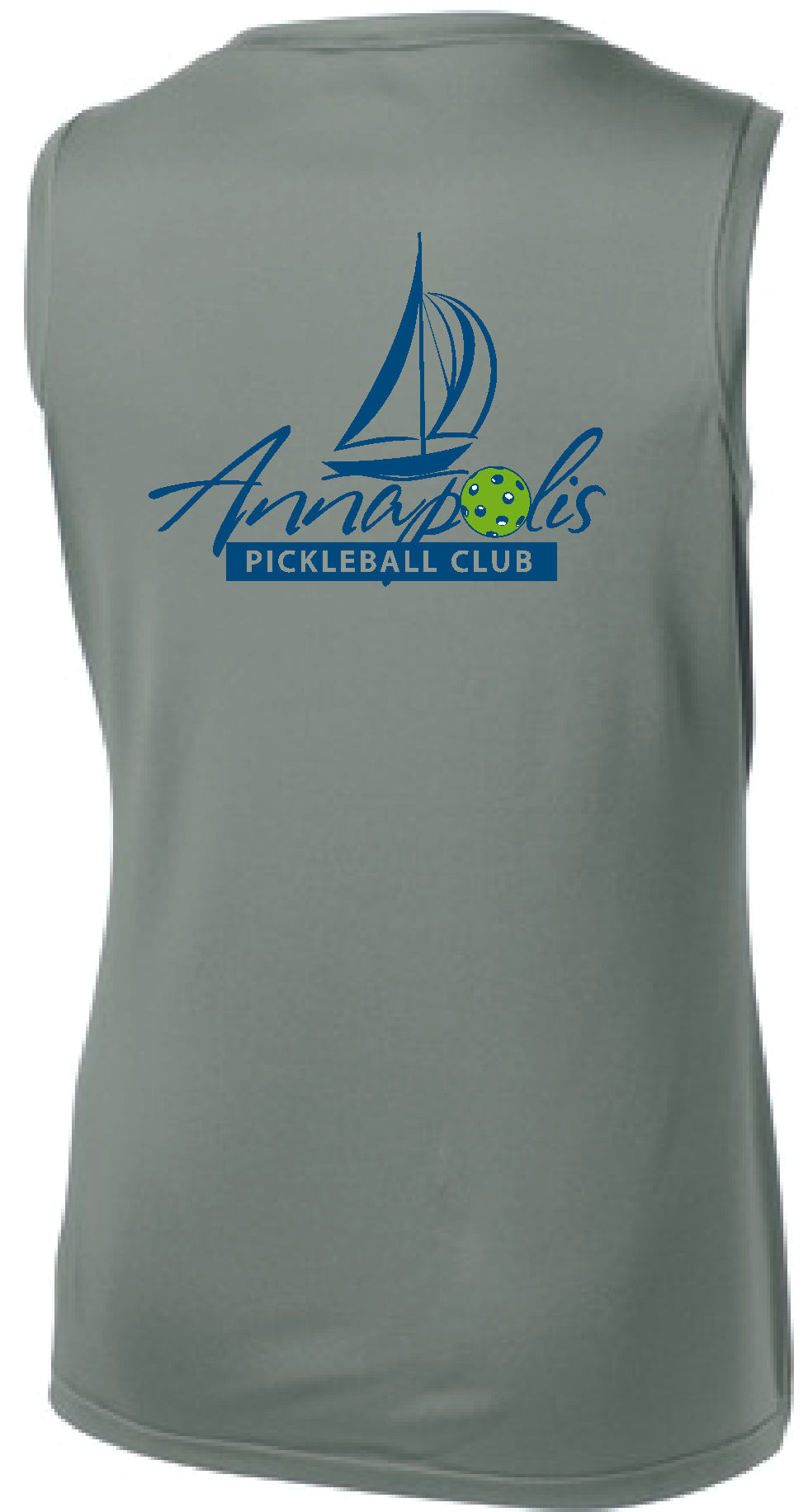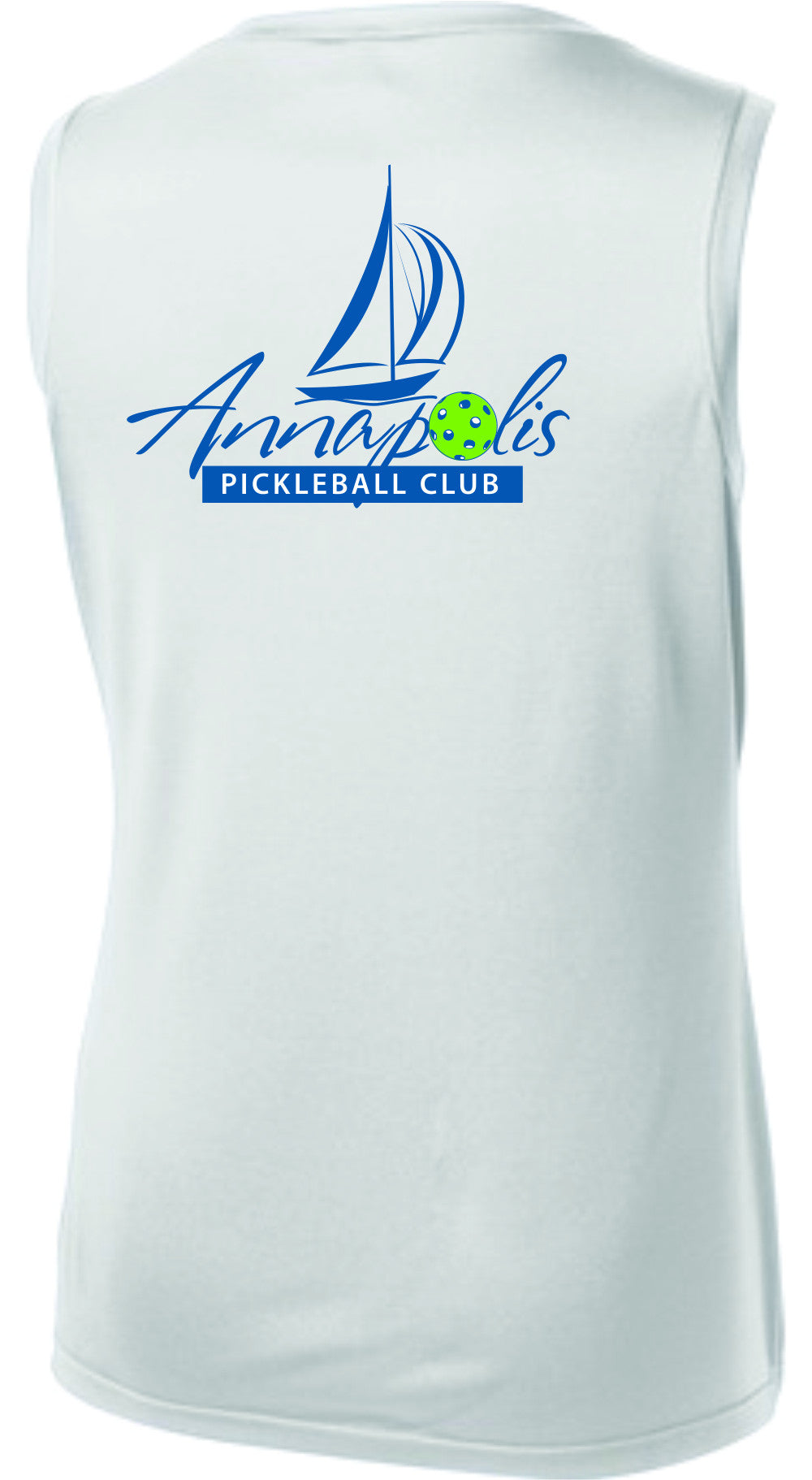 Ladies style of a Lightweight and highly breathable moisture-wicking Sleevelees tshirt with the Annapolis Pickleball Club image on the front left chest and back.
