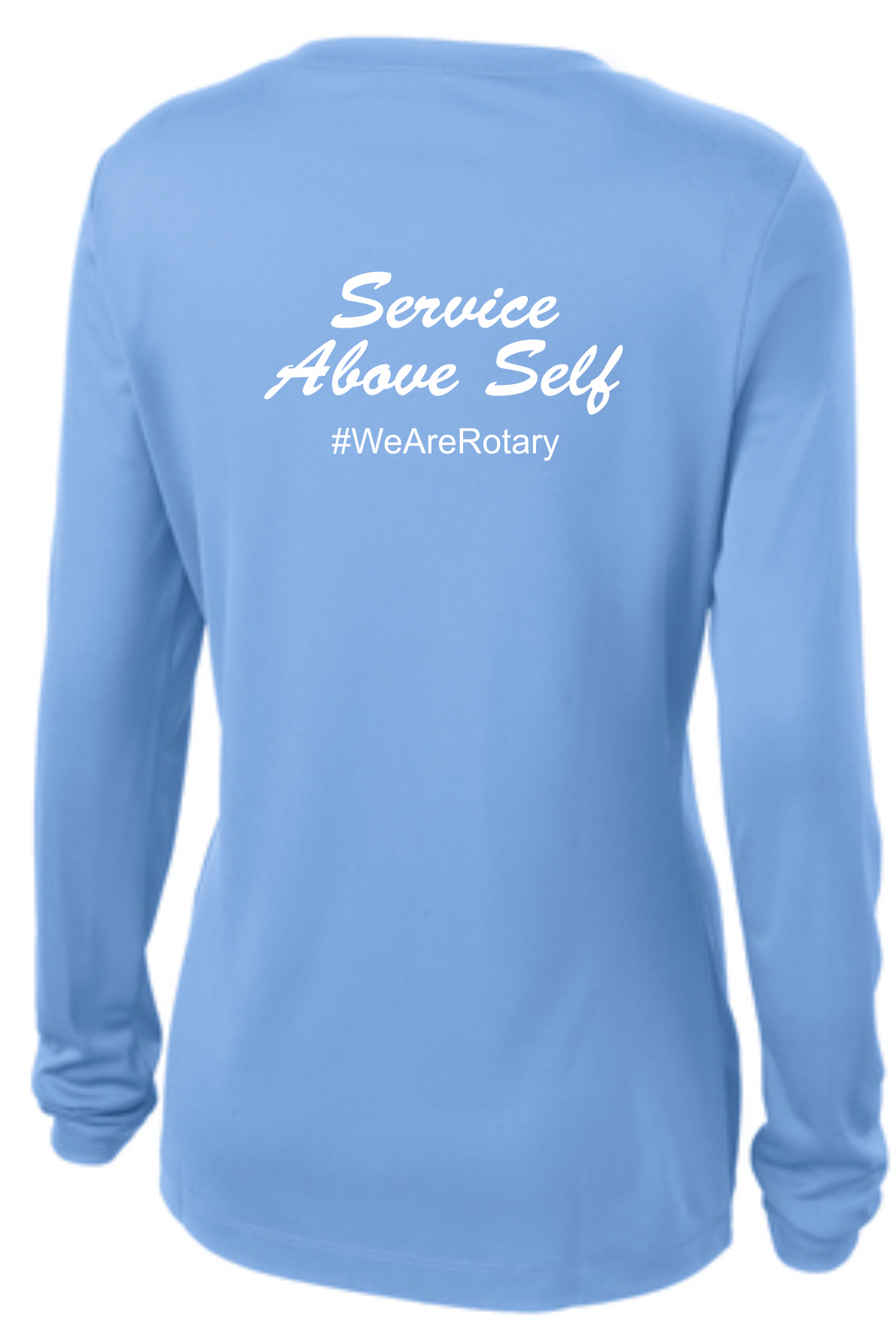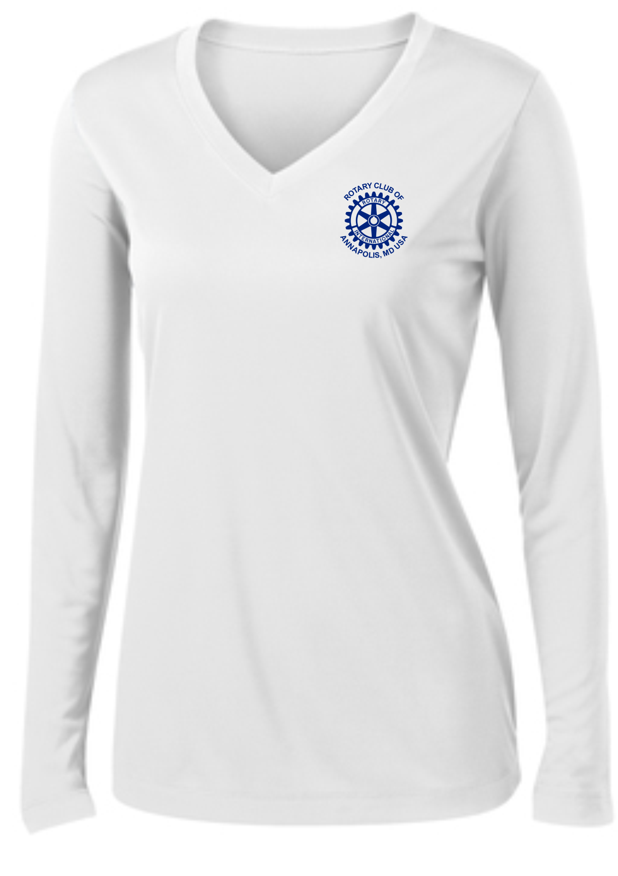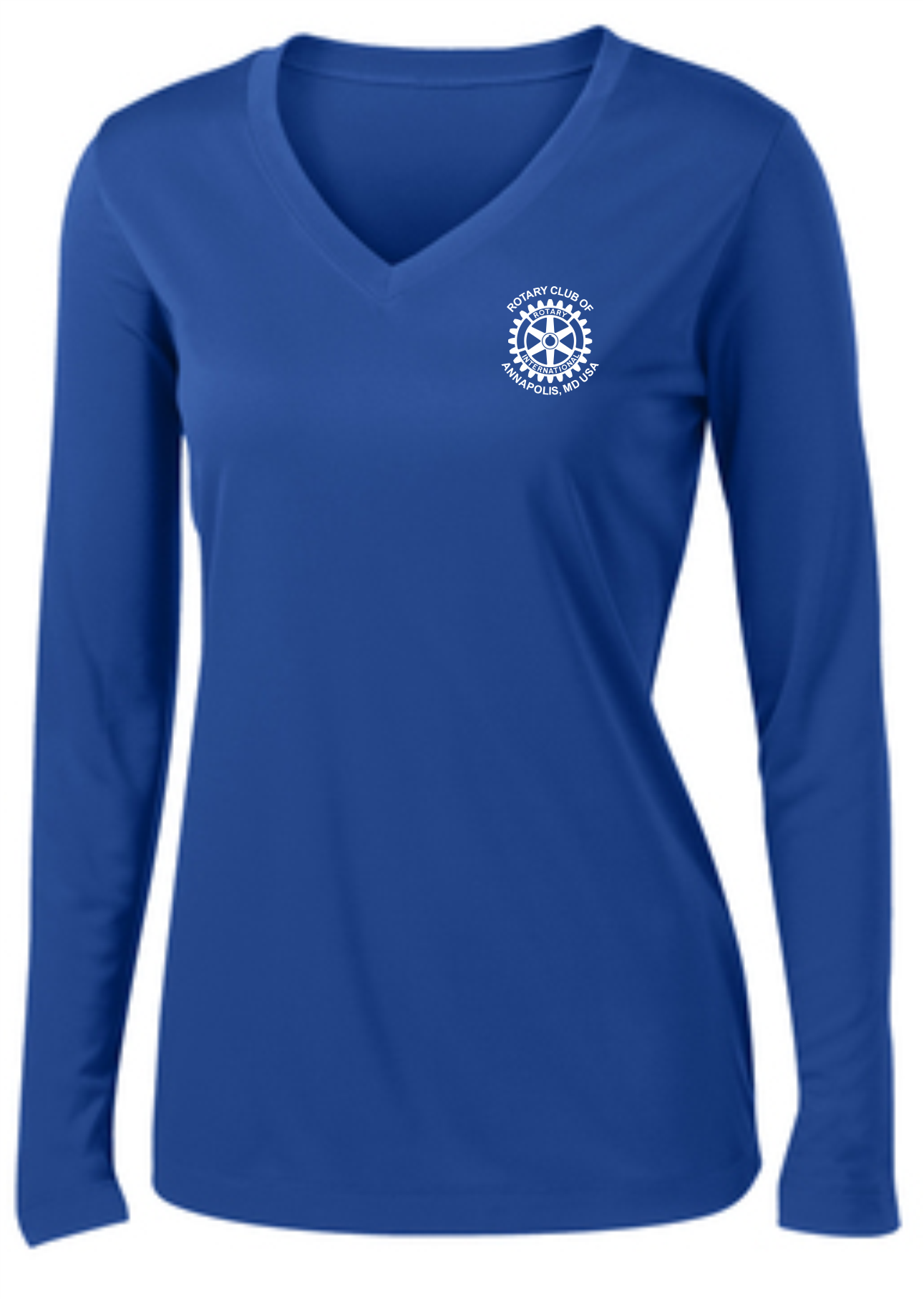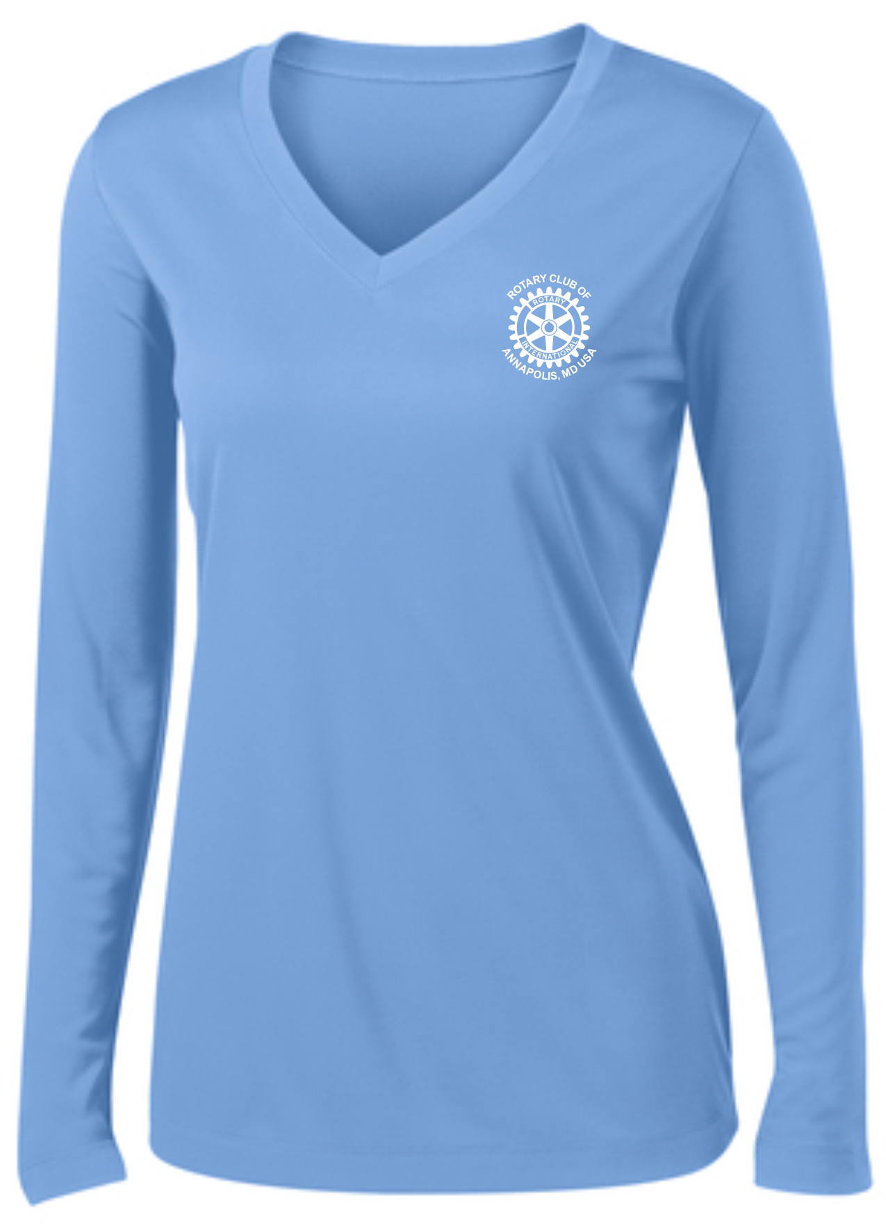 A light weight and roomy ladies v-neck technical tshirt is perfect for all weather conditions. The wicking properties make this shirt comfortable in the warm weather and in the cooler weather it is a perfect layering piece for added warmth. The Rotary Club of Annapolis, MD USA logo is printed on the front with "Service Above Self" #WeAreRotary image on the back.