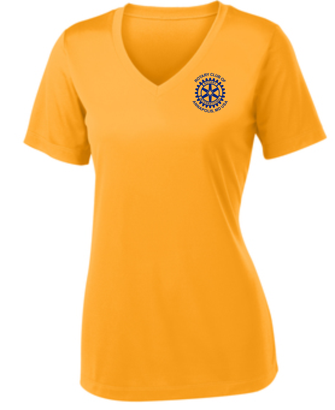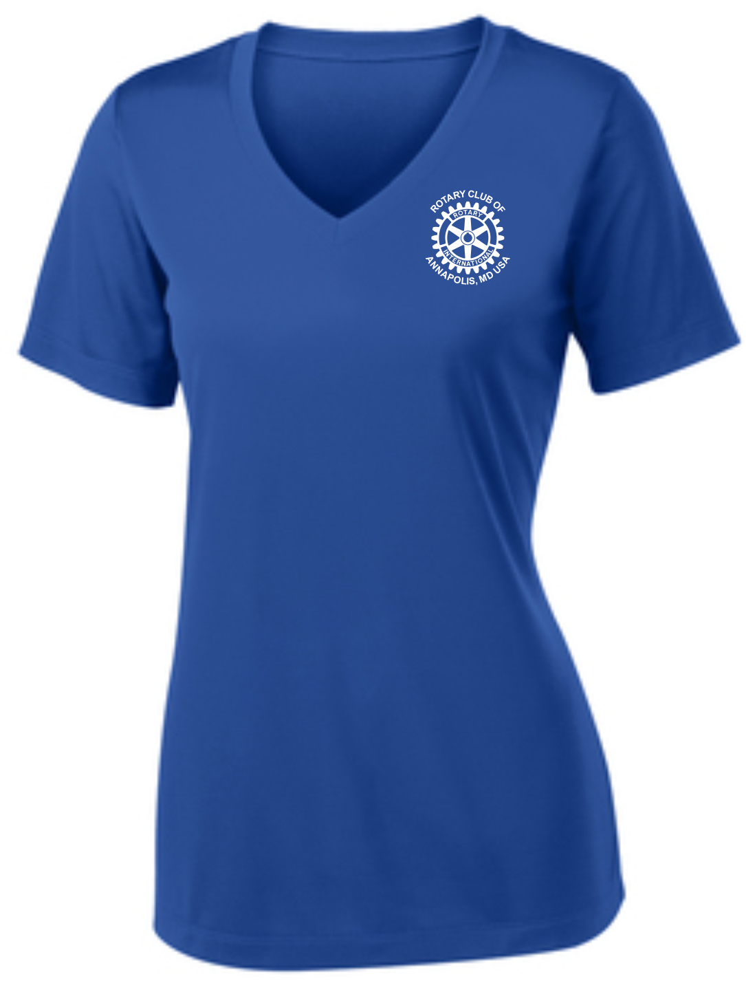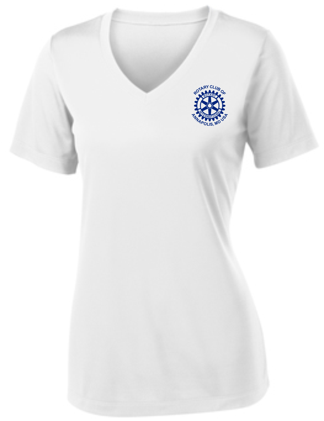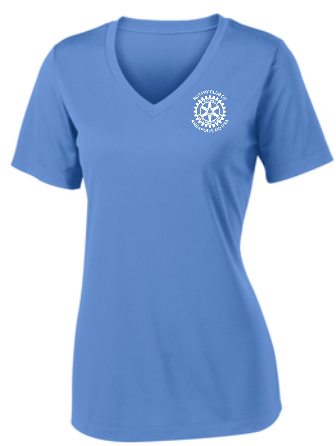A light weight and roomy ladies v-neck technical tshirt is perfect for all weather conditions. The wicking properties make this shirt comfortable in the warm weather and in the cooler weather it is a perfect layering piece for added warmth. The Rotary Club of Annapolis, MD USA logo is printed on the front with "Service Above Self" #WeAreRotary image on the back.